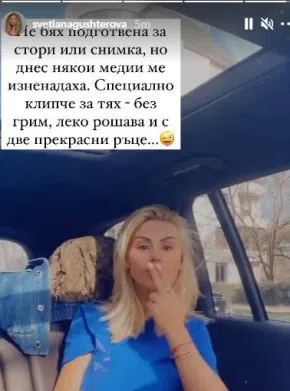 Светлана Гущерова се показа в Инстаграм без видими травми по ръцете си, след като по-рано днес плъзна слух, че е с контузен горен крайник, а за виновник за травмата бе посочен собствения й съпруг Християн. "Няма грам истина в това. Не, не съм подавала жалба срещу съпруга си.