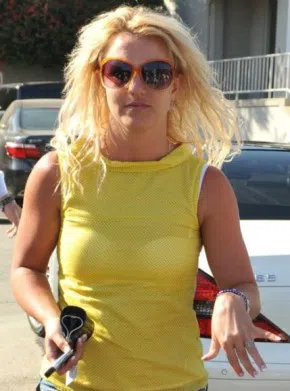 Късите панталонки Бритни беше решила да комбинира със светлорозова блузка, която също беше нарязана по краищата и излагаше на показ далеч непривлекателния й корем.