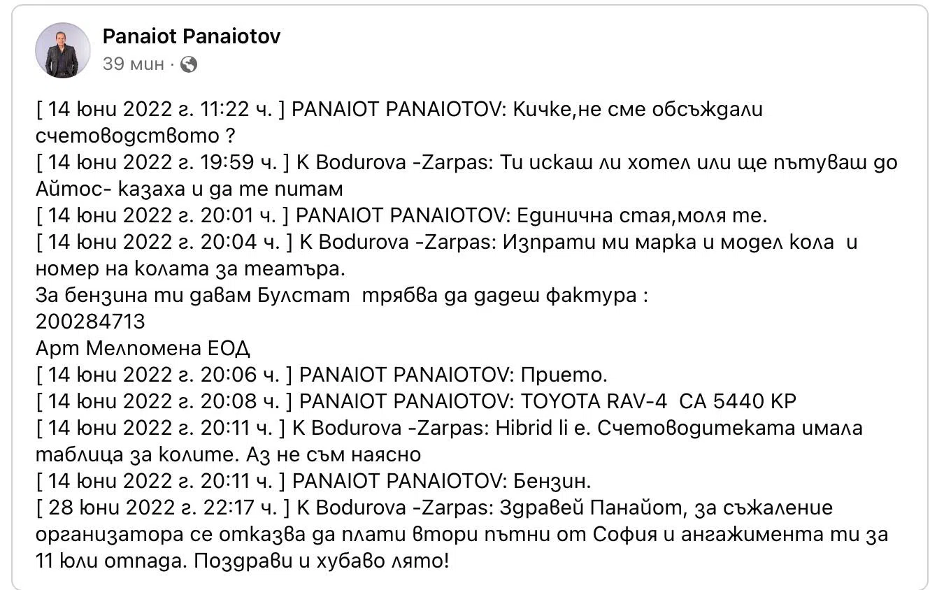 "Но получих отговор “НЕ СЕ ПРИЕМА”. Онемях … много грубо , но замълчах. Преди няколко дни ми писа да сме “оправили счетоводството”. Не разбрах какво има предвид. Но се чухме и той ми каза, че той не пътувал никога с други, ще пътува сам от София, а не с “Иван, Драган и Петкан”- известни наши 2ма музиканти, както направи Мими за Варна и иска да му се плати бензина/ би трябвало това да го каже в началото/. Не ми хареса отново грубото изказване за колегите. След разговори със същите разбрах повече за неговия характер и реших , че не искам стрес по време на работа. Затова лично отказах участието му преди 2 дни. С поста си във фейсбук вчера Панайот показа, че съм имала право - много арогантно и немъжко поведение", не спира Бодурова.