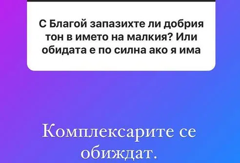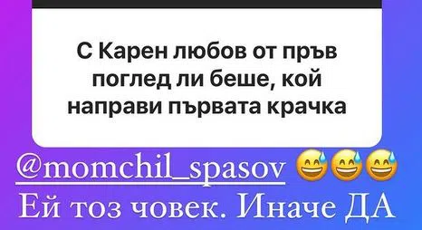 В рамките на последната седмица тя за втори път отговаря на въпроси на почитателите си, които се интересуват най-вече от новия любим на племейтката Карен. Не пропускат обаче и да разберат как я карат бившите гаджета Златка и Благой, който към този момент вече е женен за друга. Плеймейтката, наранена от бързата сватба, не пропусна отново да ухапе Георгиев-старши, видя Hotnews.bg.