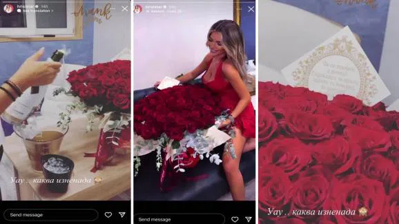 Неизвестният все още ухажор затрупа с червени рози изкусителката с микрофона. Тя се похвали с романтичната изненада като пусна снимка на огромния букет цветя, шампанско и бонбони в Instagram.Изпълнителката на "Антилопа" изглежда видимо доволна от изненадата. Христина Христова, както е истинското име на певицата, е свободна жена от около месец. Преди това тя имаше сериозна връзка с ММА боеца, но според слуховете до раздялата им се е стигнало заради побой, който Недко е нанесъл на изпълнителката.