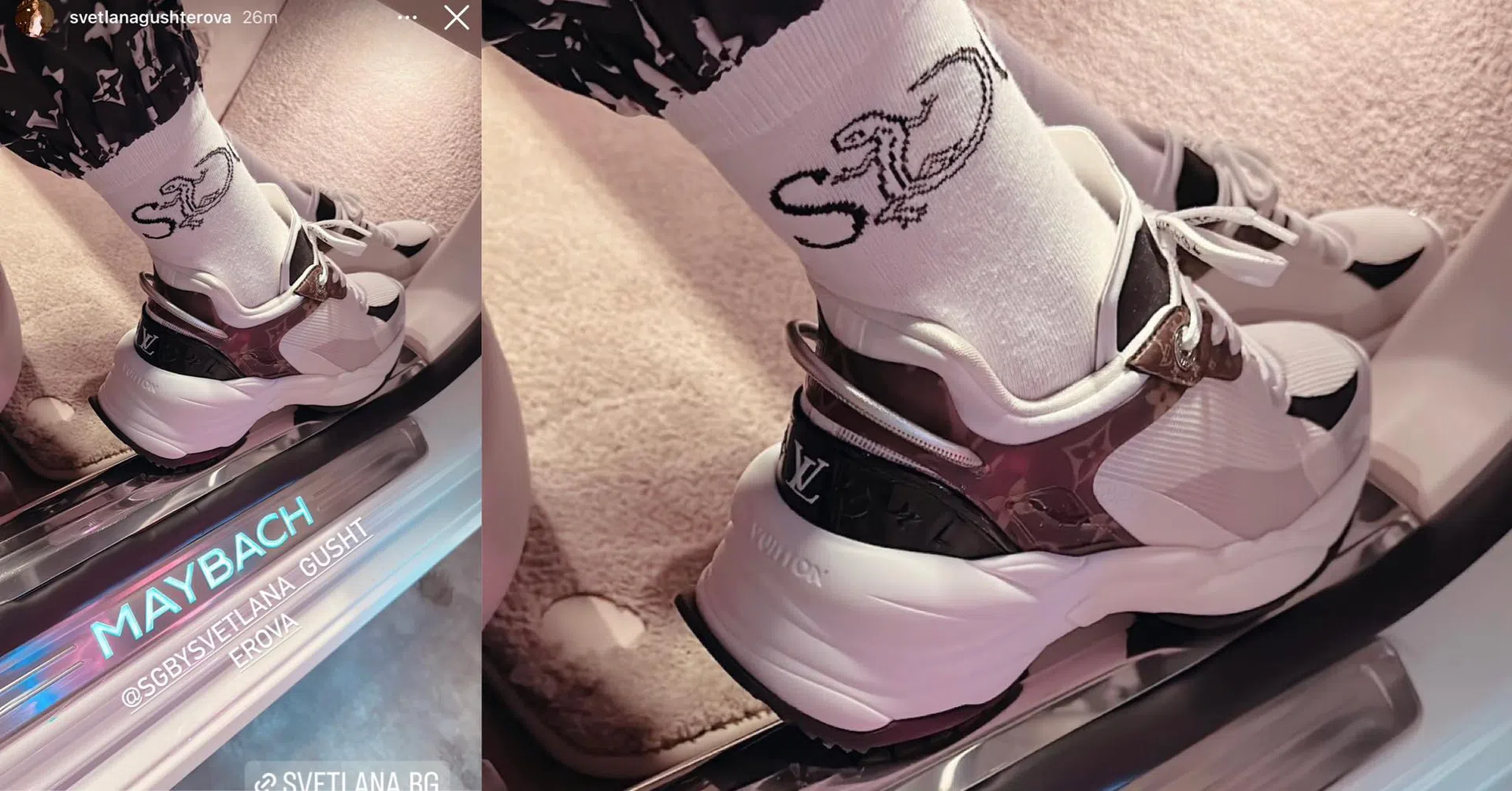 Познавачи коментират в социалната мрежа, че Гущерова стъпва върху 2 хиляди лева и се оказаха прави - цената на елитните спортни обувки в интернет е 950 евро. От сторито на Гущерова се вижда, че и спортният й панталон е на френската луксозна модна къща, а неговата цена вероятно е поне два пъти колкото маратонките. В стайлинга на моделката присъстват и чорапи от собствения й бранд с нейните инициали SG.