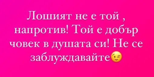 Това написа бившата плеймейтка, която дори прие пръстен от Жоро пред цяла България по време на живо предаване на "Като две капки вода". Вчера Жоро отново се изпокара с част от жените в двата отбора, които директно го обвиниха, че не търпи чуждо мнение и те се страхуват от него.