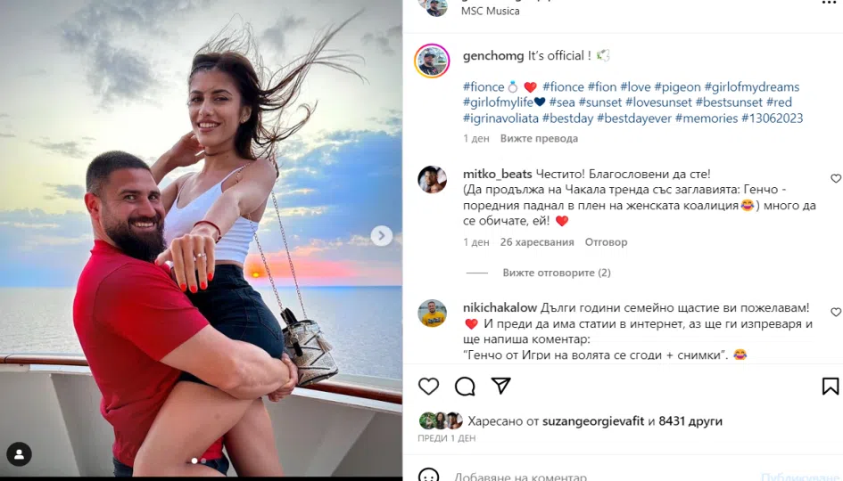 Преслава Пачеманова каза заветното "да" на риалити участника. Кадри от щастливия момент се появи в профила и на двамата в социалните мрежи. Както се вижда двамата са на романтично пътуване в Гърция. Бъдещата булка Преслава също като него е родом от Харманли и е лекоатлетка, модел и архитект по образование.