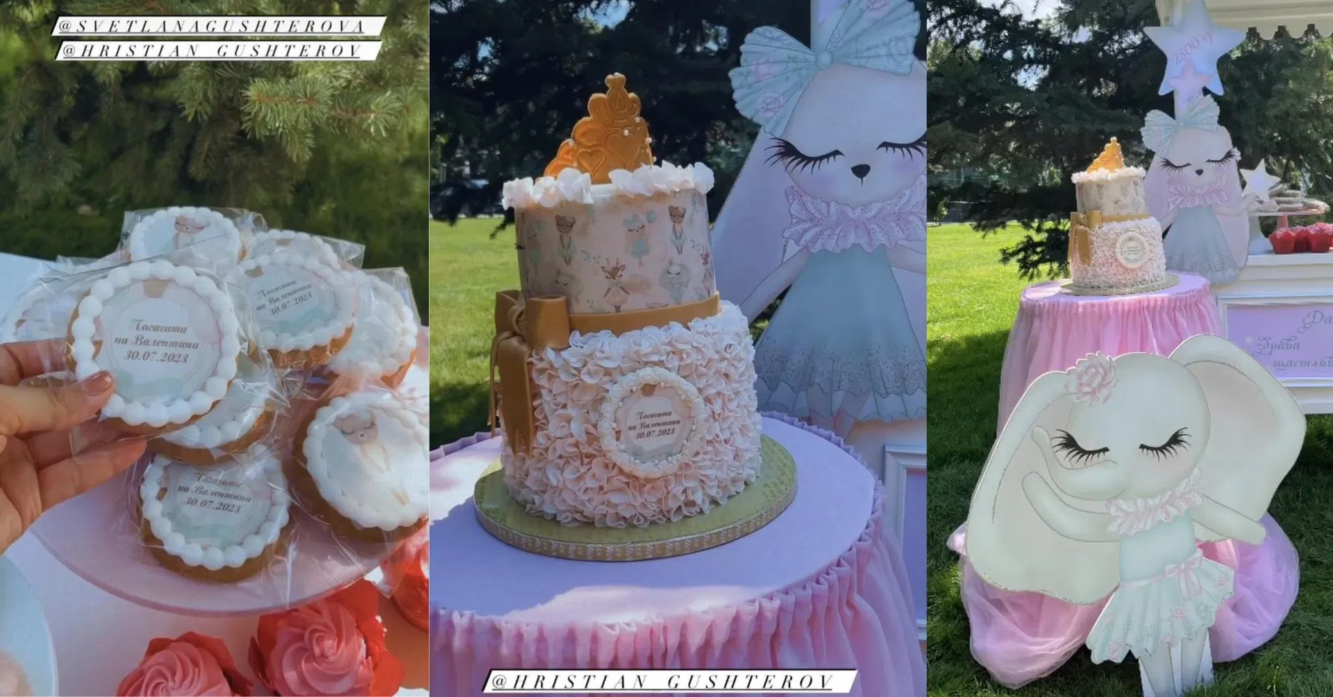 Това се разбра, след като някои от присъствалите "добри феи" изпревариха събитията и пуснаха сторита, преди Гущерова да сподели с последователите си в Инстаграм радостното събитие. Също по традиция, бебето не се вижда никъде на тях, тъй като младата майка е обсебена от манията да държи децата си далеч от светлините на прожекторите.