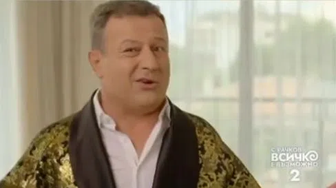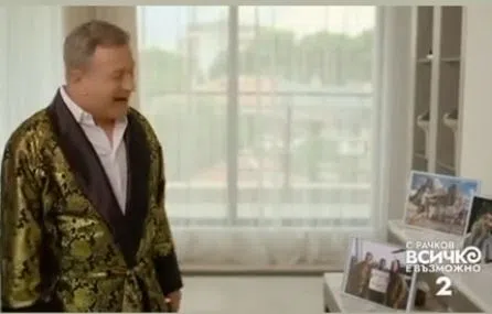На нея комикът е по халат в луксозен апартамент, който друг известен се опитва да продаде или даде под наем. Става дума за съпруга на синоптичката от Нова телевизия Гергана Малкоданска Александър Ковачев, който е дизайнер и се занимава с обзавеждането на луксозни къщи и яхти. Той щедро предоставя безплатни мебели и аксесоари на продукциите на телевизията срещу реклама и Рачков също се възползвал от примамливата оферта, разбра Hotnews.bg.