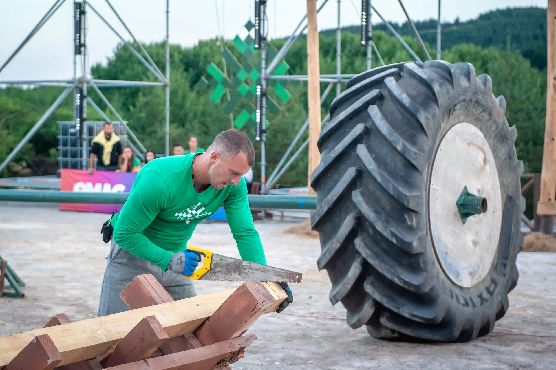 Първата индивидуална битка за един пендар - бутане на гигантска гума и рязане на филии от греда, сблъска „червения“ Борис и „зеления“ Андрей. Оперният певец показа забележителни умения с триона, но остана без дъх при местенето на гумата. Въпреки че преживя серия от кризи и получи болки в ръцете, той не се отказа. Съперникът му обаче беше по-бърз и „Елбетица“ поведе с 1 на 0.