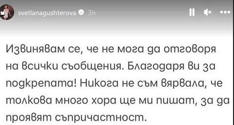 Извинявам се, че не мога да отговоря на всички съобщения. Благодаря ви за подкрепата. Никога не съм вярвала, че толкова много хора ще ми пишат, за да прояват съпричасност. Смятам, че това, през което преминавам аз и моето семейство, не трябва да се премалчава, а точно обратното-всеки, който е жертва на подобен тормоз с риск за живота си, трябва да говори и да алармира компетентните органи. Това е единственият начин, да предотвратим насилието".