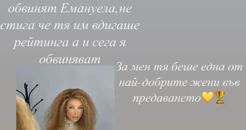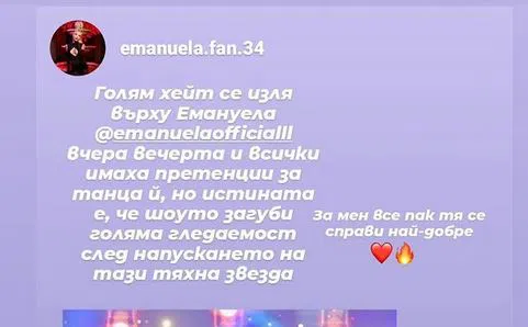 Не само Емануела, но и нейните фенове са ядосани, че любимката им е изгонена и заплашват никога повече да не гледат нито телевизията, нито танцувалното шоу. "Ти си нашата победителка", тръшкат се чалгарите. Други обаче са категорични, че тя не е била за "Денсинг старс", а за "Ергена". "Емануела е една изтрещяла, нагла и безочлива кифла", пише зрителка на Фейсбук страницата на предаването.