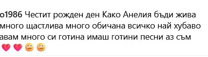 Певицата е родена на 1 юли 1982 година и стана на 42 години. Партито е било в красивата просторна къща в полите на Витоша на открито, а денственият гост, който певицата показа е дъщеря й Ивон. Една честитка обаче със сигурност й е дошла повече, видя Hotnews.bg. Отдадена фенка минава границата на добрия тон и се обръща към изпълнителката с "како", а това няма как да не подразни суетата на Анелия, която прави всичко възможно, за да не се дава на времето и да задържи младостта.