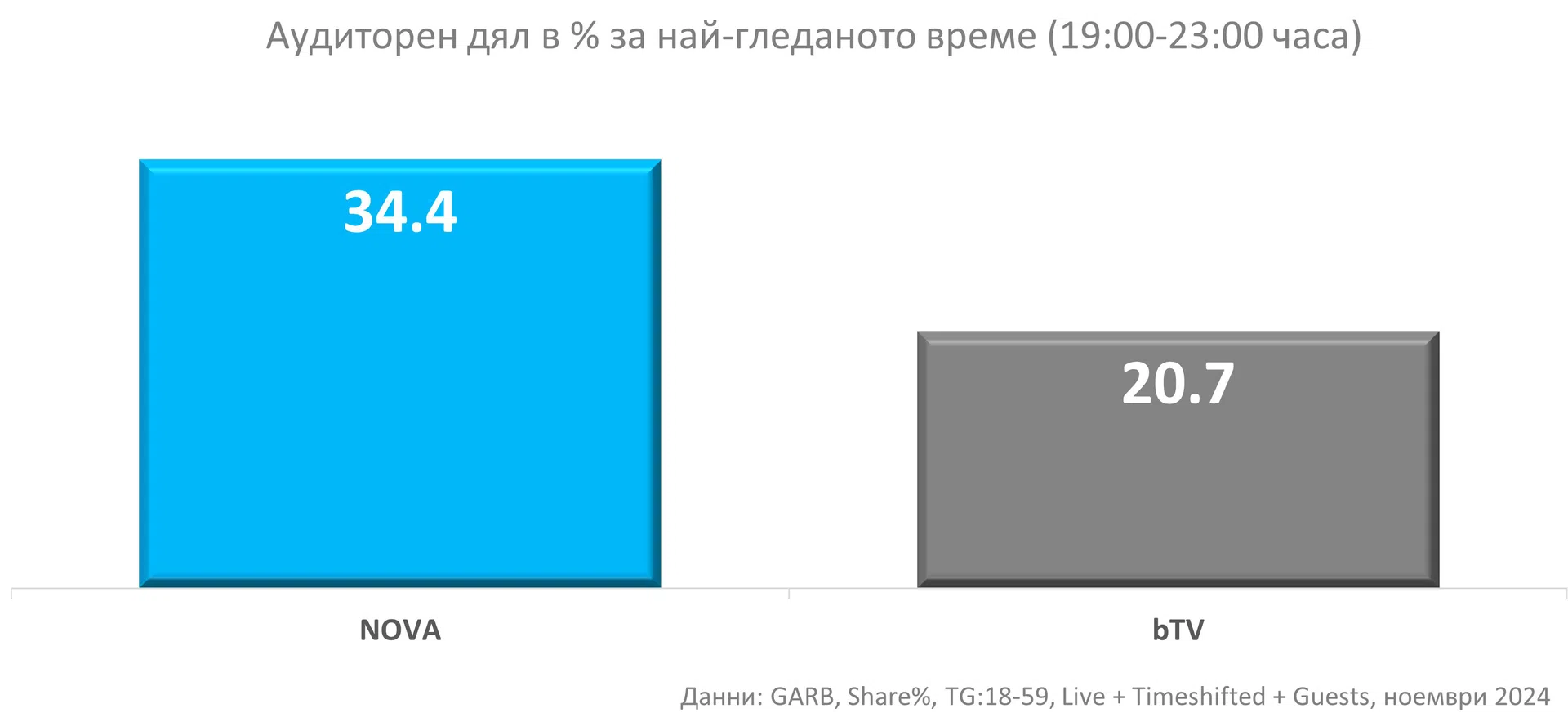След регистрираните през октомври рекордни резултати, официалните пийпълметрични данни за месец ноември показват още по-високи стойности. Според тях, аудиторният дял на NOVA през ноември в най-гледаното време (19:00-23:00 ч.) е средно 34,4% сред зрителите в активна възраст (18-59 г.). Това е нова рекордна стойност от създаването на медията - най-високата отчитана за месец ноември. Разликата спрямо втората телевизия в класацията също нараства, похвалиха се официално от медията.