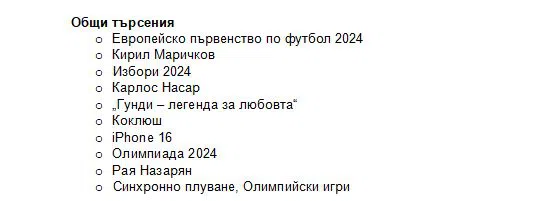 Сред тях се открояват големи спортни събития, технологични новости и културни феномени. Европейското първенство по футбол 2024 беше най-очакваното спортно събитие на континента и стана акцент в търсенията за годината. Разнородните музикални интереси на сънародниците ни са видими в списъка с най-търсените концерти. В челната тройка се нареждат концертите на Тони Стораро, Ед Шийрън и Преслава, следвани от тези на Лили Иванова, Андреа Бочели и Цеца Величкович.