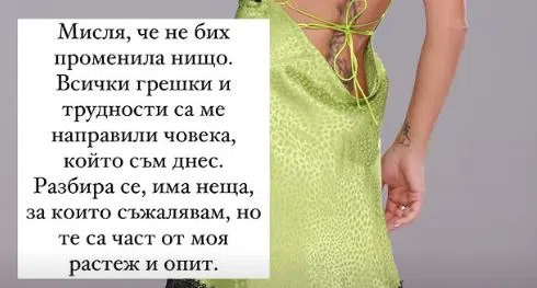 Василева е категорична, че не би променила живота си, защото благодарение на грешките в него се е изградила като характер. Признава обаче, че има грешки, за които съжалява. Дали сред тях е бракът, който продължи само няколко години и завърши с куп караници, тепърва ще стане ясно.