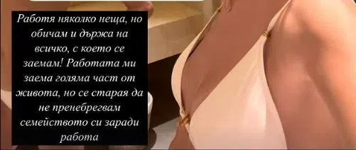 "С регулиран график нещата вървят доста леко", споделя тя. "Работя няколко неща, но обичам всичко, с което се заемам. Работата ми заема голяма част от живота".