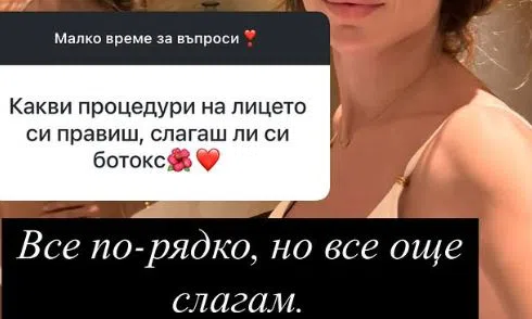 Нещо, което прави веднъж на високосна година. Красавицата реши да бъде откровена и призна, че се боде с ботокс, но уж го прави все по-рядко. „Какви процедури на лицето си правиш, слагаш ли си ботокс?” – пита я последователка.
